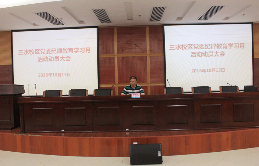 根据校党委统一部署,三水校区党委于10月13日下午在图书馆学术报告厅召开了纪律教育学习月活动动员大会,校区全体党员和管理岗、专业技术人员参加了会议。会议由校区管委会副主任柳国斌主持。