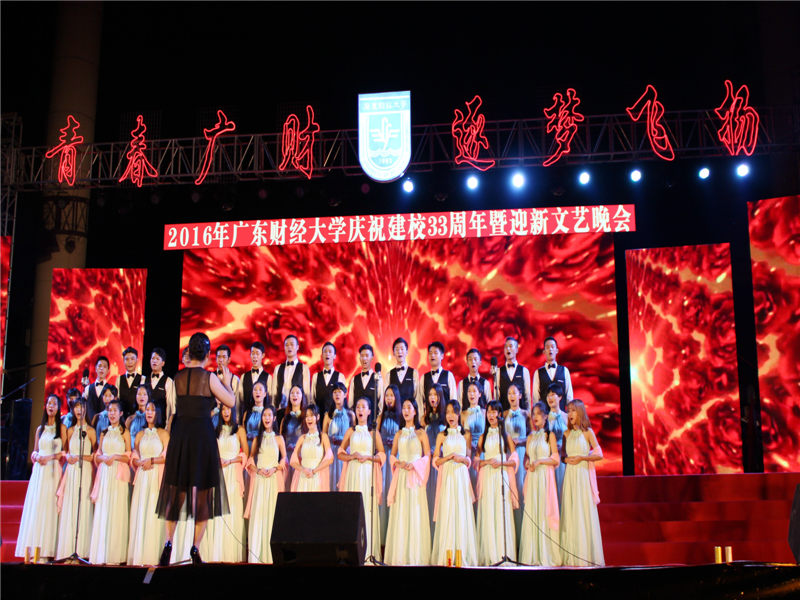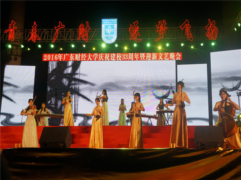 10月25日晚,以“青春广财,逐梦飞扬”为主题的广东财经大学庆祝建校33周年暨迎新文艺晚会在佛山三水校区图书馆正门前广场举行。校党委书记黄晓波,校长于海峰,校党委副书记吴琦,副校长王廷惠、陈国栋,中国电信三水分公司总经理施金兵、副总经理潘灿忠以及学校各单位党政主要负责人与六千多名新生一起观看了这场视听盛宴。