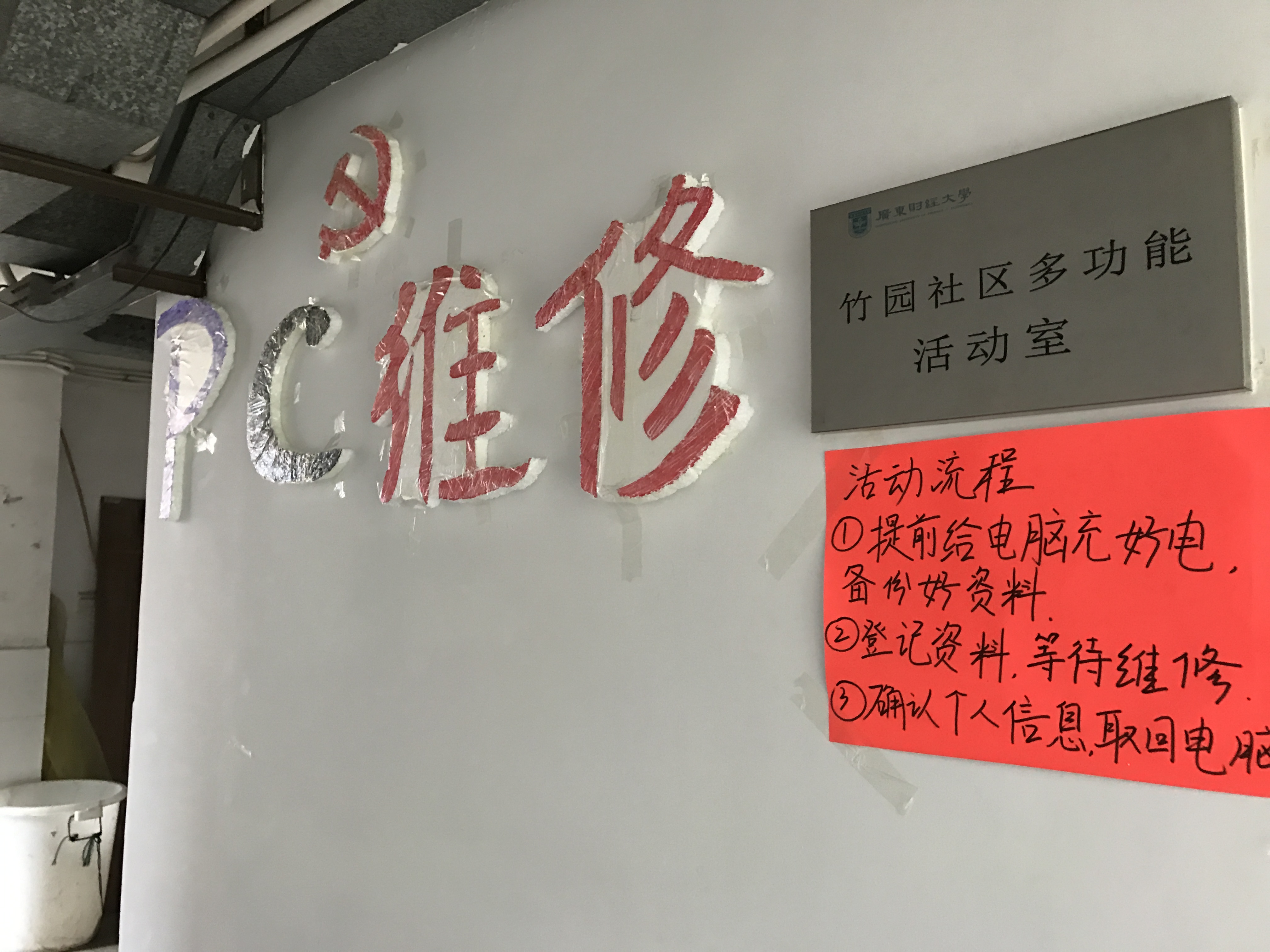 2016年11月22日至23日,为更好践行“两学一做”学习教育,发扬为“为人民服务”的宗旨,信息学院党章社在学生竹园社区19栋多功能活动室开展了“学生社区免费pc维修”活动,为校区的师生免费提供电脑维修服务。