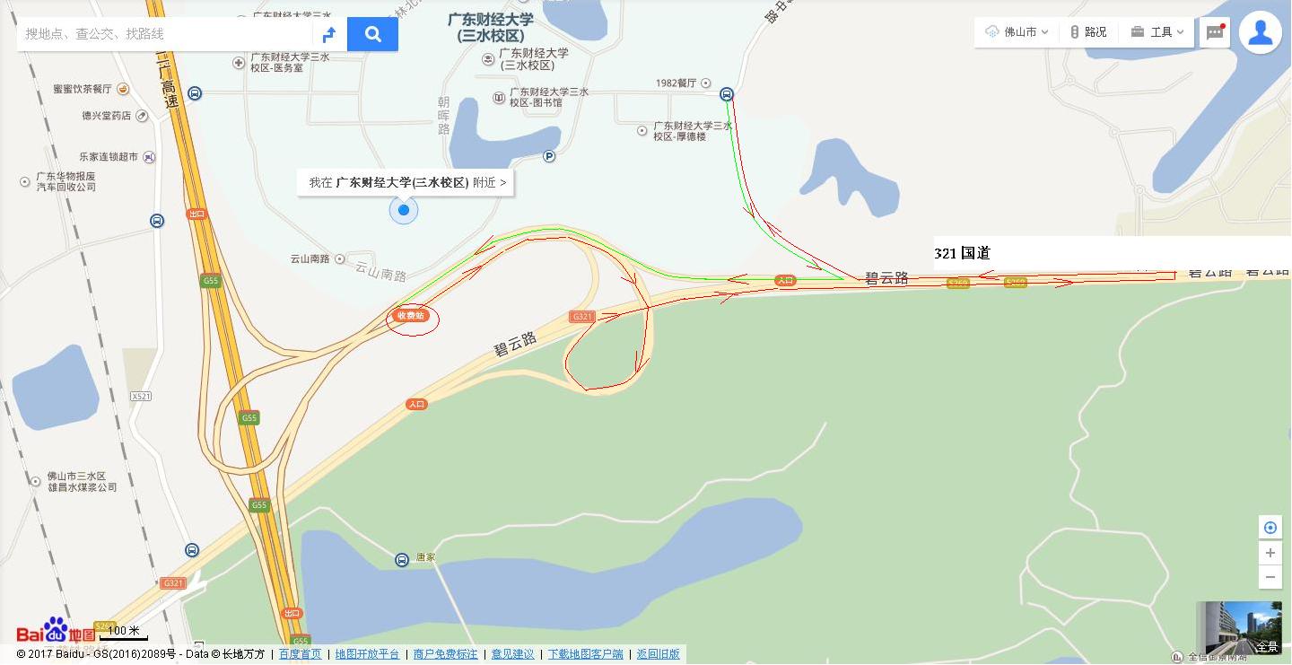 5月12日,学海路(即三水校区东门到321国道之间道路)通过交工验收,当日下午正式通车。至此,三水校区东门出行状况得到根本改变。我校师生驾车从广州出发,出广贺高速唐家收费站后,转道321国道,在三水庄园调头后走约600米即可到达三水校区东门;驾车从三水校区回广州,从东门出发,沿学海路经321国道可直接从唐家收费站上广贺高速回广州。往、返程均可以节约10分钟时间。