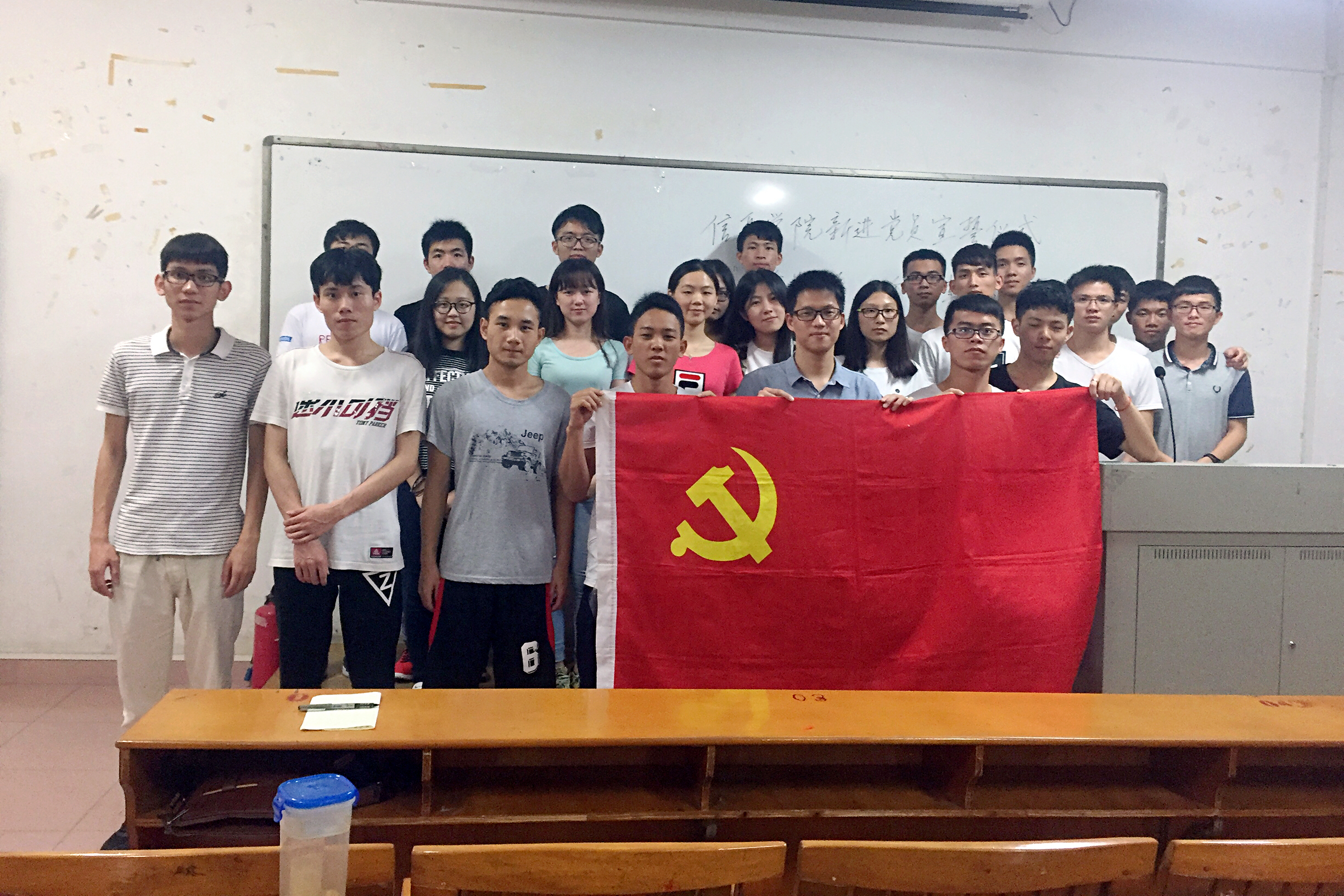 2017年5月18日晚,信息学院学生党支部在实验楼230进行庄重的入党宣誓仪式。同时,结合今年4月4日习近平总书记对广东工作作出的重要指示批示精神,党支部开展了以“四个坚持、三个支撑、两个走在前列”为主题的学习分享会。