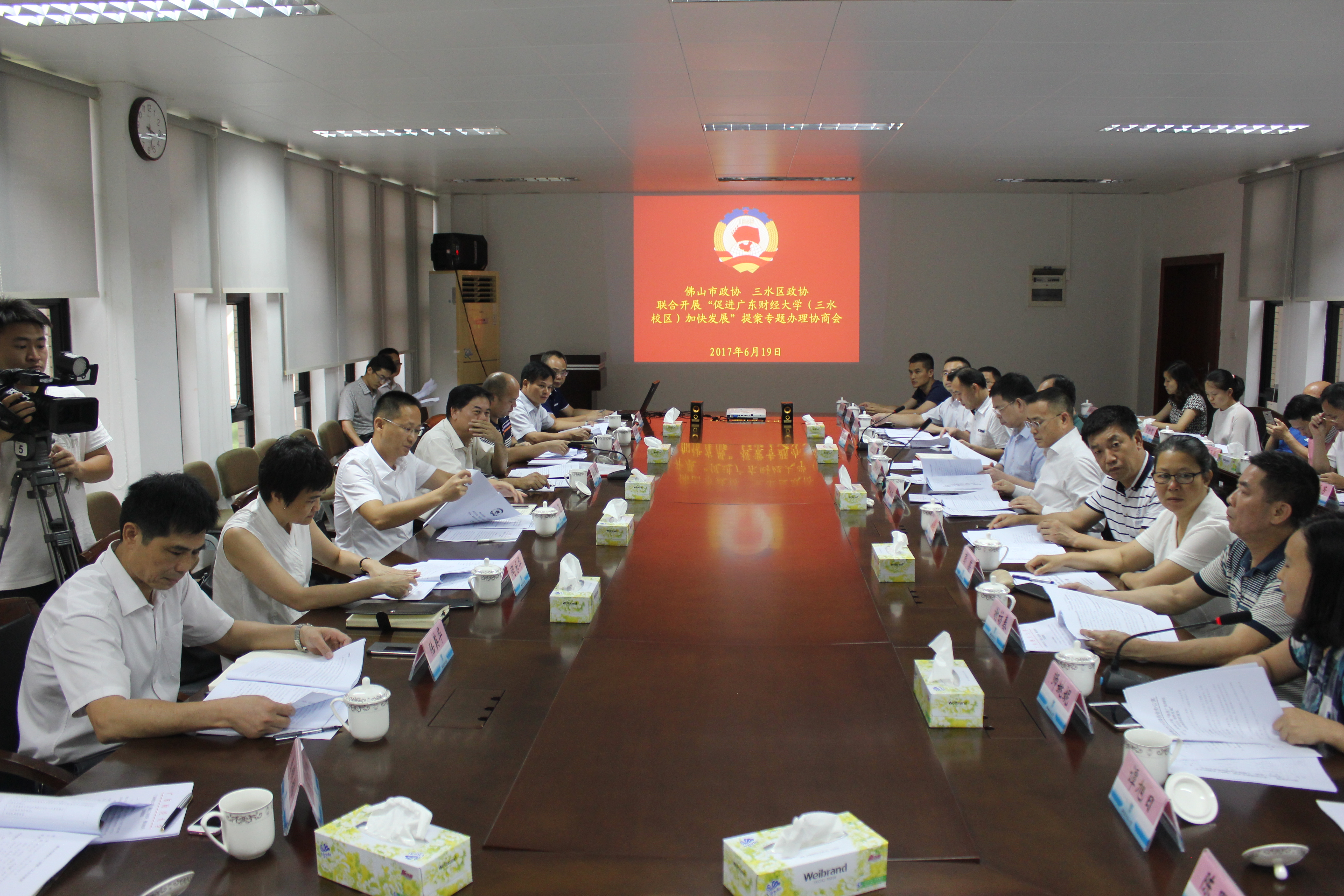 6月19日下午,佛山市政协、三水区政协关于“促进广东财经大学(三水校区)加快发展”提案专题办理协商会在我校佛山三水校区举行。佛山市政协副主席骆毓林、市纪委派驻市政协机构纪检组长黄永全、提交本提案的市、区政协委员,佛山市教育局副局长杨汉波、三水区副区长江飞、区人大常委会副主任张卫红、区委统战部常务副部长严振飞等市、区领导,我校副校长邹新月,校区党委书记、管委会常务副主任谢访春出席协商会。会议由市政协提案委副主任刘淘主持。