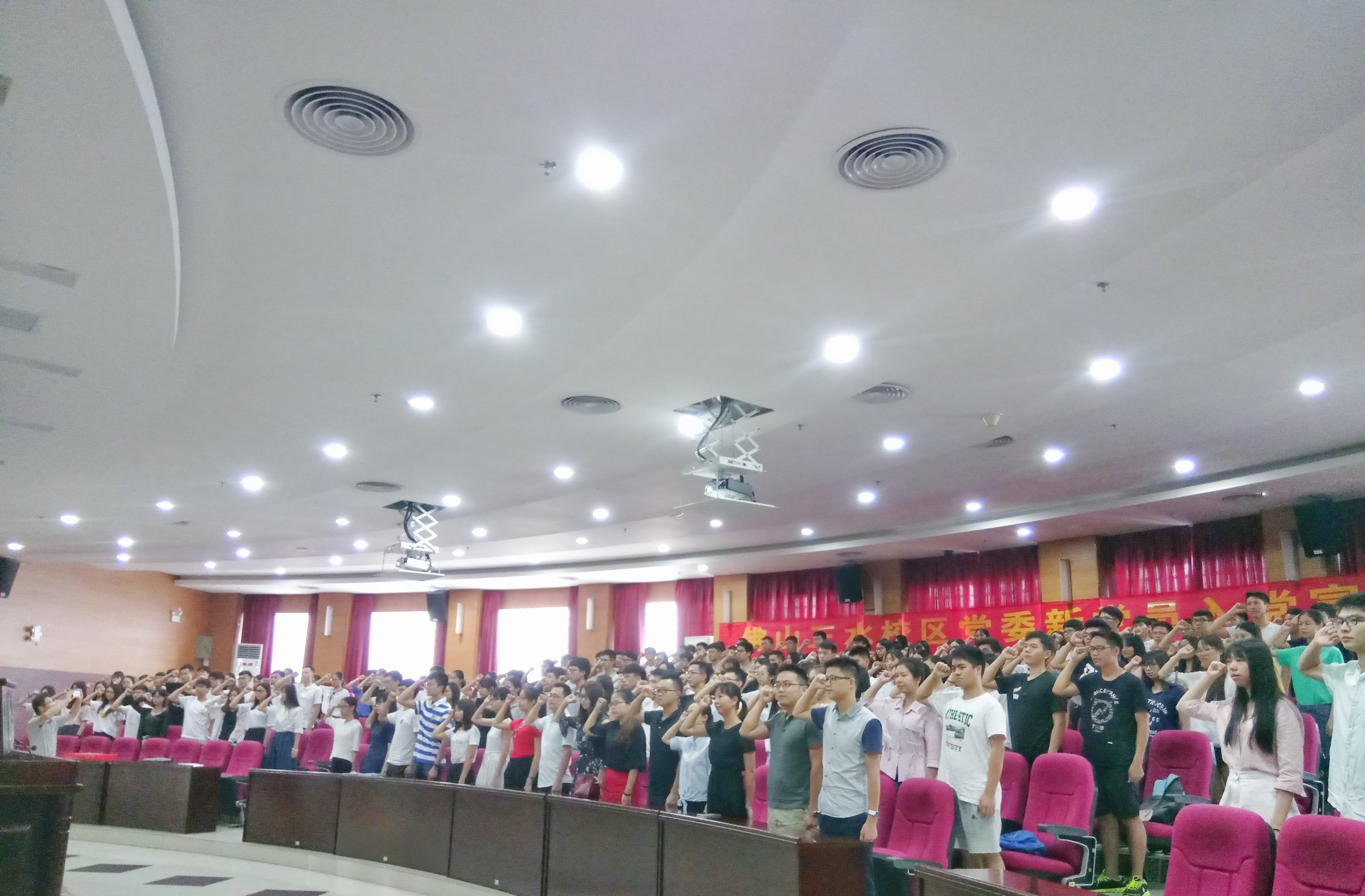 广东财经大学佛山三水校区党委于2017年6月23日下午2:30在图书馆学术报告厅举行了新党员宣誓活动。包括校区新老党员、党支部书记约220人参加了宣誓仪式。宣誓仪式由校区党委钟智副书记主持。