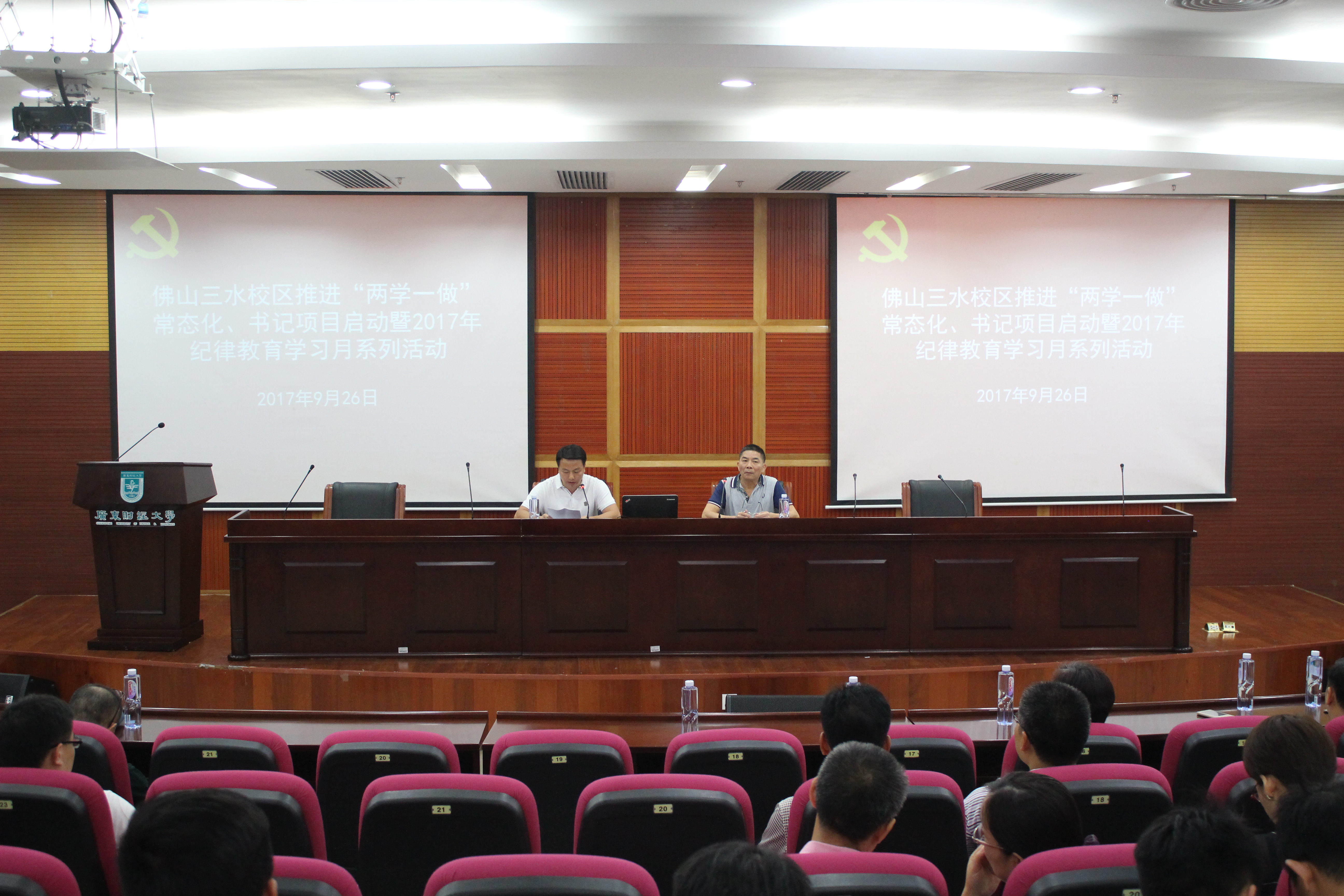 9月26日上午,为深入学习贯彻习近平总书记系列重要讲话精神和治国理政新理念新思想新战略,以“四个坚持、三个支撑、两个走在前列”为统领,以“讲政治、强党性、严纪律、守规矩”为主题,紧紧围绕推进全面从严治党、推进“两学一做”学习教育常态化制度化工作的要求,佛山三水校区(以下简称“校区”)2017年纪律教育学习暨书记项目推进会在校区学术报告厅举行。校区党委、管委会班子成员及各部门负责人,各党支部书记及校区科级工作人员参加会议。学习活动由校区党委副书记钟智主持。
