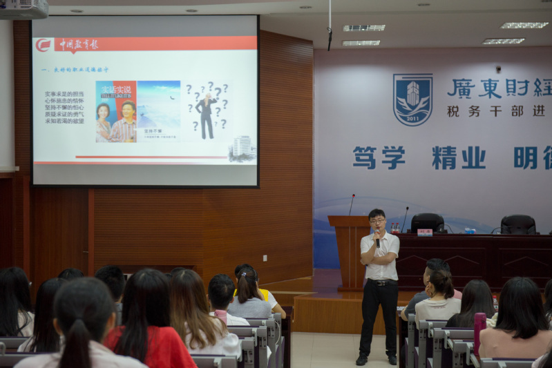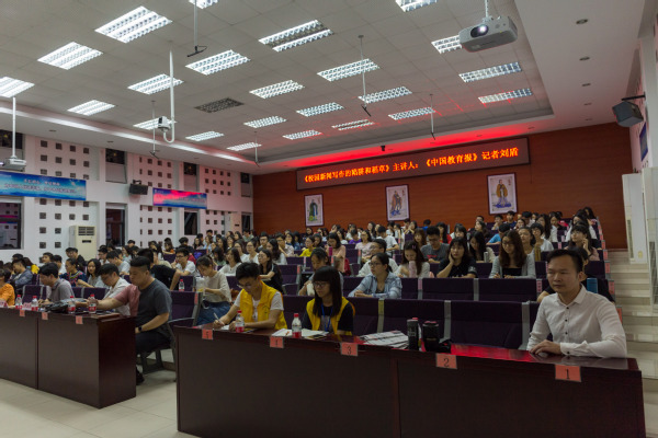5月9日晚,中国教育报广东站记者刘盾在我校佛山三水校区(以下简称“校区”)厚德楼税干厅作以《校园新闻写作的陷阱与稻草》为主题的讲座。学校党委宣传部部长罗贤甲、校区负责新闻宣传的校级学生社团、各学院学生干部代表共两百余名师生参加讲座。讲座由党委宣传部副部长罗玉燕主持。