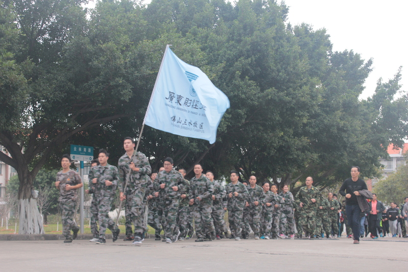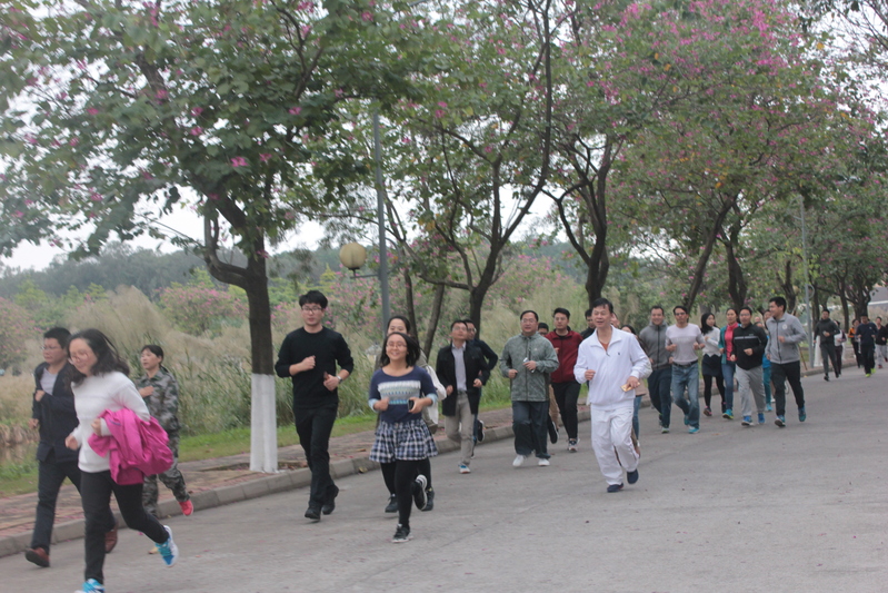 动员讲话后,校区长跑队伍由校区校卫队整齐的方阵开路,校区党政领导班子及学院、部门队伍也紧随其后。本次长跑从东门出发,经过涟湖,中心花园、二饭堂、教师公寓再回到东门,全长约2000米。