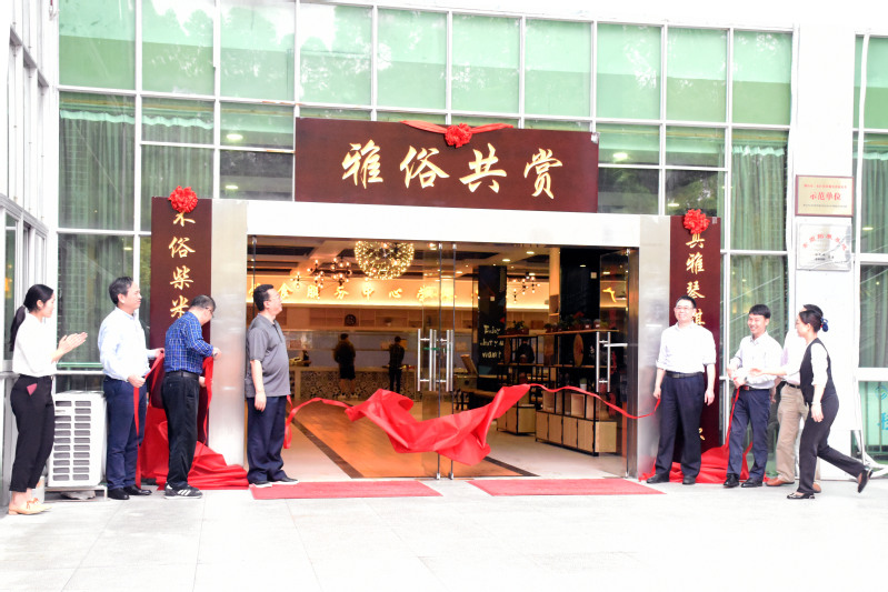 与会领导共同揭幕,刻着“雅俗共赏”四个字的牌匾映入眼帘。牌匾的两边还有一副并含诗意与生活气息的对联:典雅琴棋书画诗歌赋,不俗柴米油盐酱醋茶。