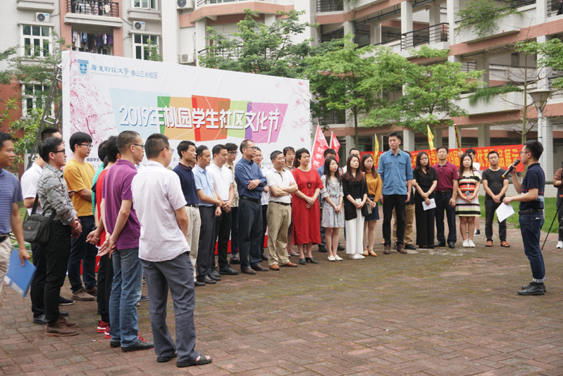 学校学工部胡卫标部长宣布佛山三水校区桃园2019年社区文化节开幕。指出学工部将会同校区管委会及相关学院一起,积极探索学生宿舍社区化管理新模式,为每位学生提供优美、舒适、温馨的学习生活环境。