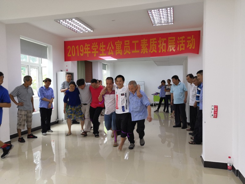 上午八点半,经过小游戏“捶捶背”“抢钱”,大家进行了简单的热身运动。随后,公寓员工迅速组成4支队伍,选出队长,起了响亮的队名,拉开了拓展活动的序幕。活动过程中,大家听从指挥,齐心协力,大胆挑战。队员们互相加油、互相鼓励,完成了“凌波微步”“蒙眼敲锣”“三人四足”“带球冲刺”和“杯子传水”5个拓展游戏。这些游戏比速度比合作,无一不是考验大家的团队协作能力和快速适应能力,只有队伍团结一心,才能取得好的成绩。只有沟通与信任带来的团队凝聚力,才能促进大家心在一起,共同达成目标。有完美的沟通,就会有完美的结果。“鹰击长空队”赢得冠军,“马到功成队”“虎之队”“龙之队”分别获得亚军、季军、殿军。
