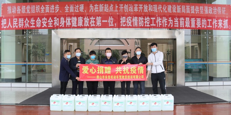 同舟共济共克时艰,众志成城共战疫情。佛山市永佳机动车驾驶员培训有限公司心系我校抗疫工作,3月7日下午,公司总经理谢秋凤一行到访佛山三水校区,向校区爱心捐赠20桶(每桶40升)84消毒液。永佳驾校雪中送炭,校企共抗疫情,同盼春暖花开。