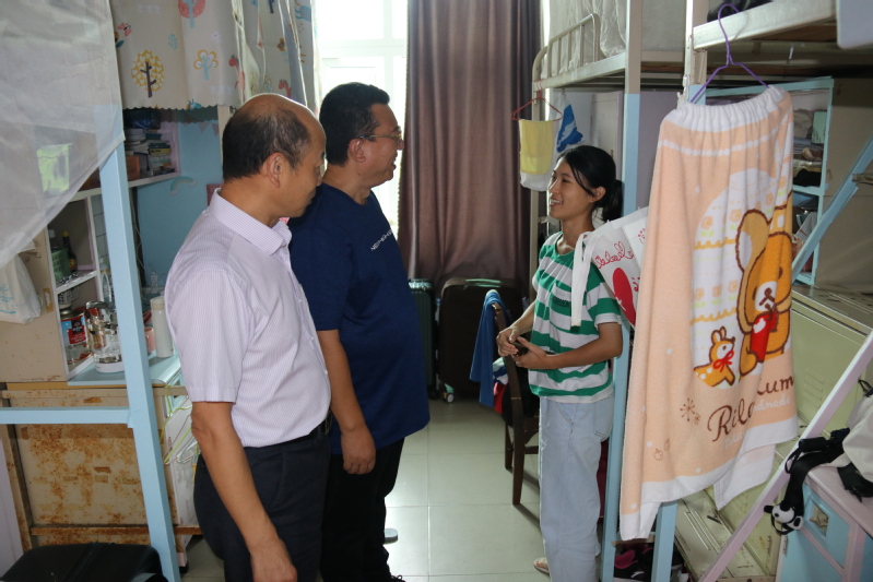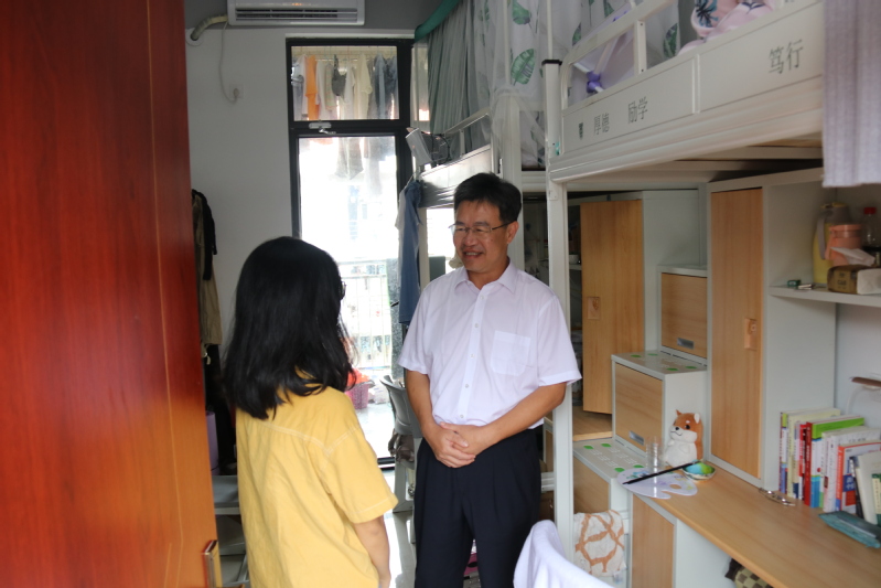 陈国栋一行走进留校学生宿舍,与学生亲切交谈,向他们及其家人致以节日祝福,详细了解同学们在假期的生活和学习安排,同时叮嘱同学们在假期做好个人防护,非必要不外出,提高安全意识和防范能力。陈国栋还代表学校给留校困难学生发放了慰问品。