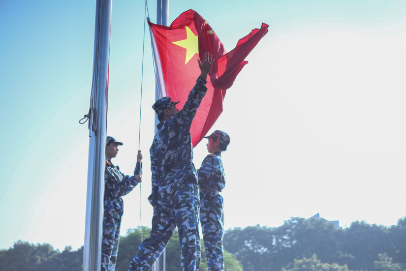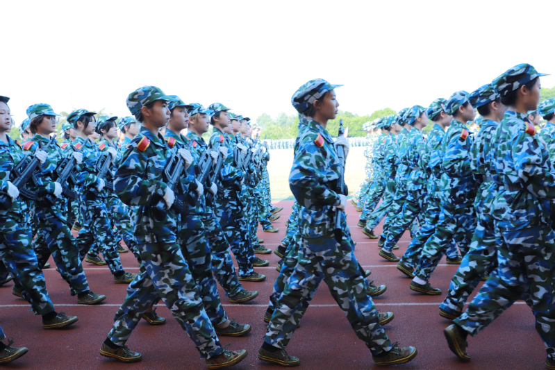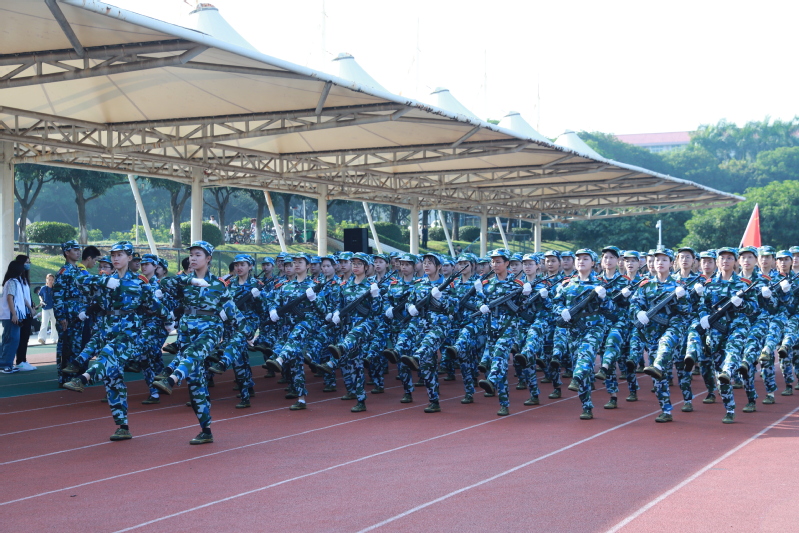当国旗在空中飞扬时,军训成果汇报的分列式开始。各方阵步伐矫健,掷地有声,一声声口号尽显中华儿女英姿。在标兵的带领下,各方阵气质昂扬地依次顺利从主席台前走过。