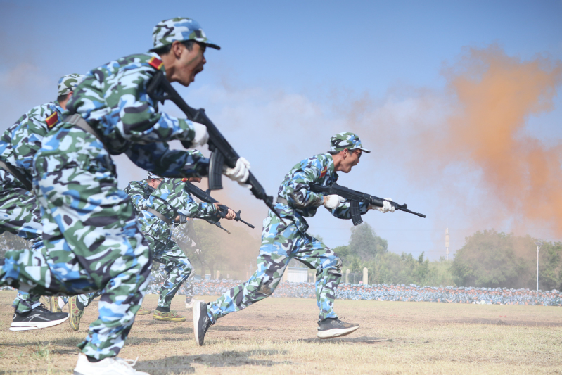 分列式汇报完毕后,军事科目汇报表演紧随其后。在激昂雄壮的音乐中,短棍术方队与拳术方队以流畅连贯的动作赢得满堂喝彩,而之后的刺杀方队、匕首操方队和花样方队动作干净利落,走位井然有序,最后的战术表演方队身披迷彩,脸画谱,展现了不怕困难的神勇英姿。正如主持人所言:“胜利属于他们,未来属于他们。”