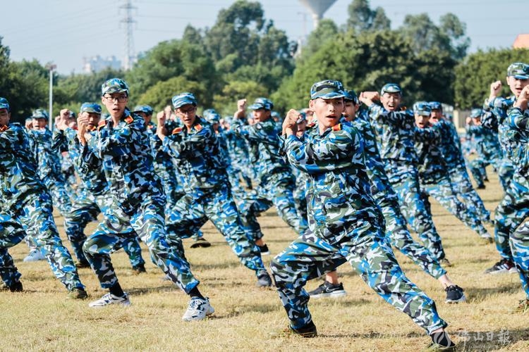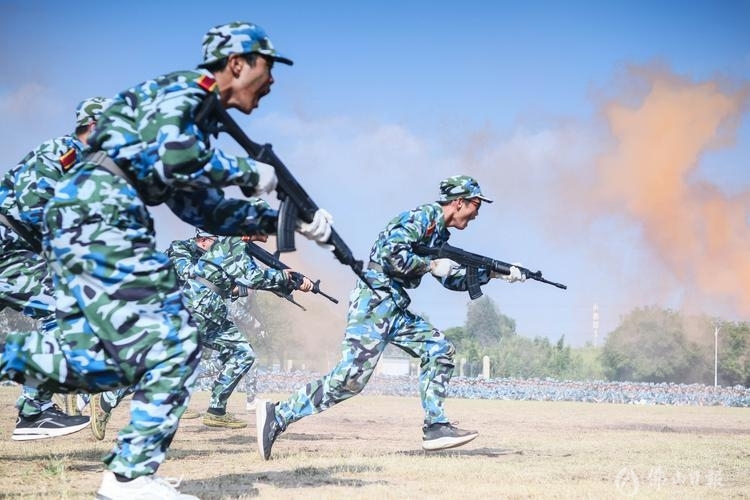 军事科目汇报表演,新生们身姿标准,精神饱满,斗志昂扬。/佛山日报记者王伟楠 通讯员叶梓摄