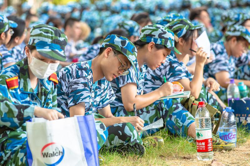 爱军训休息的间隙,新生们正在学习(摄影:王澍)