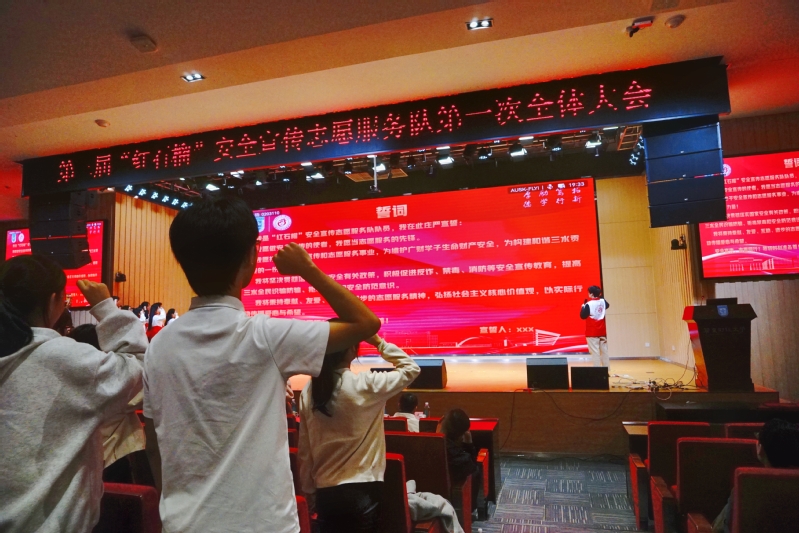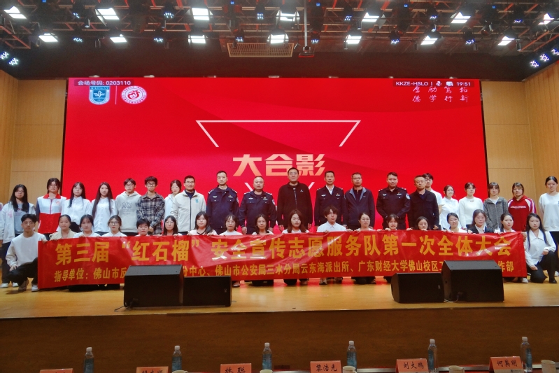 12月2日,广东财经大学佛山校区第三届“红石榴”安全宣传志愿服务队第一次全体大会在佛山校区同心楼111报告厅顺利召开。佛山市公安局三水分局副局长黎浩光,云东海街道办事处副主任、派出所所长何英明,佛山市公安局三水分局治安大队大队长赖友顺、刑侦大队教导员李锦和;佛山校区工作部部长刘大鹏、副部长林聪,佛山校区工作部保卫办主任曾忠诚、学工部副部长张自广出席大会,保卫办全体工作人员、红石榴安全宣传志愿服务队全体队员、各学院学生代表参加会议。