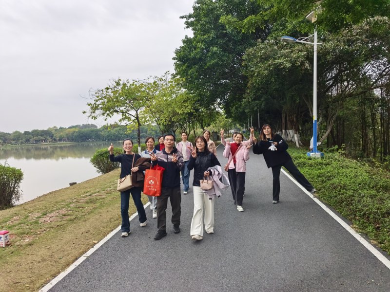 讲座结束后,大家齐聚云东海国家湿地公园入口。作为佛山市首个国家级湿地公园,云东海湿地拥有千亩湖面、万亩生态林,是珠三角地区不可多得的“城市绿肺”。沿着湖岸步道缓缓前行,湖面波光粼粼,沿岸宫粉紫荆、木棉花、黄花风铃木次第盛放,引得大家频频驻足拍照。徒步过程中,大家结伴而行,时而交流工作心得,时而分享生活趣事,平日忙碌在岗位上的老师们卸下工作压力,在清新自然环境中舒展身心。