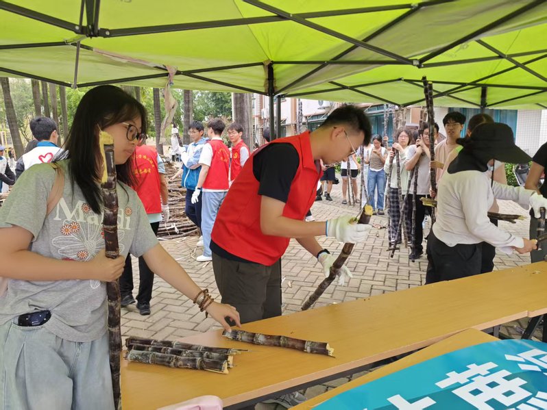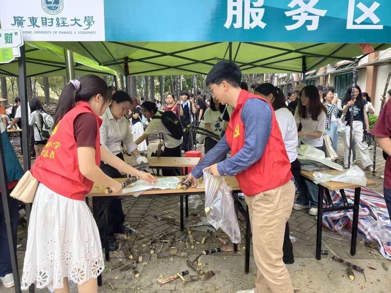 四个党支部强化协同,精心筹划,在活动前,细致对接南沙区相关单位,落实甘蔗运送事宜,并做好派发点踩点、现场布置和宣传物料准备。活动当天早上7时,甘蔗分别送达两校区。志愿者们行动迅速、协同合作,协助甘蔗卸货、存放,现场为师生开展甘蔗切段、削皮等服务,确保清甜甘蔗及时送到师生手上。